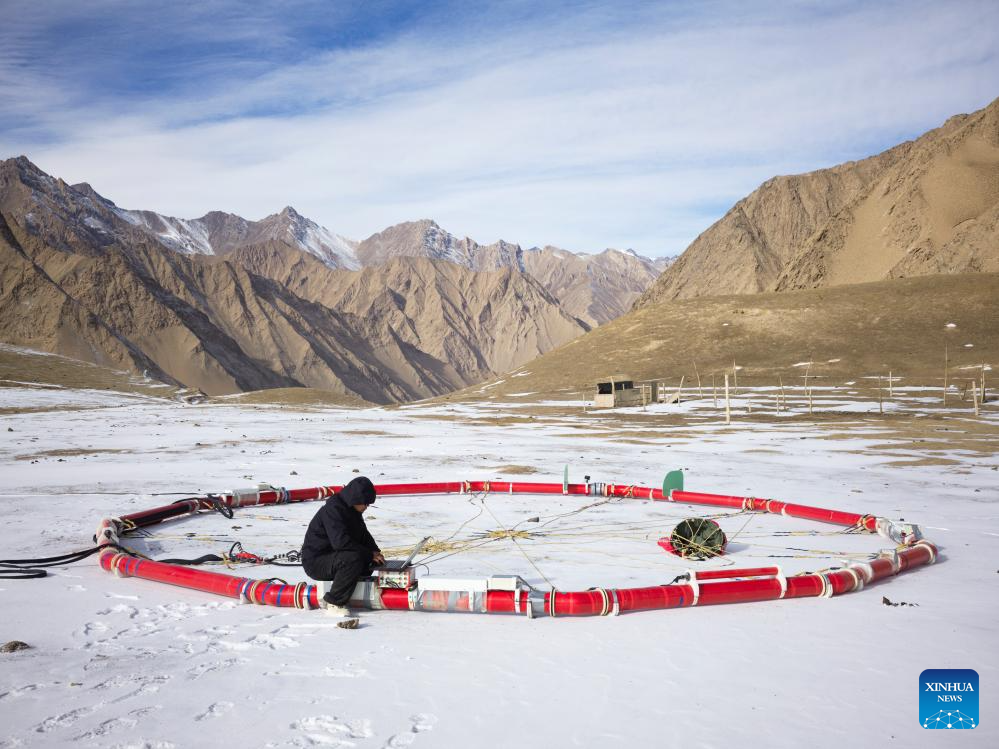 A researcher tests the helicopter airborne magnetotelluric detection system in Hetian, northwest China's Xinjiang Uygur Autonomous Region, Jan. 11, 2025. China's first helicopter airborne magnetotelluric detection system has been successfully applied to a plateau railway construction project, the Chinese Academy of Sciences' Aerospace Information Research Institute (AIR) said on Tuesday. (Photo by Guo Feng/Xinhua)