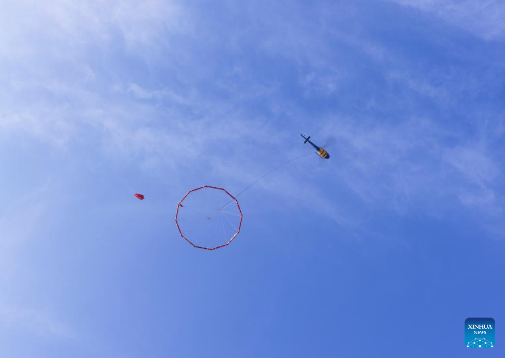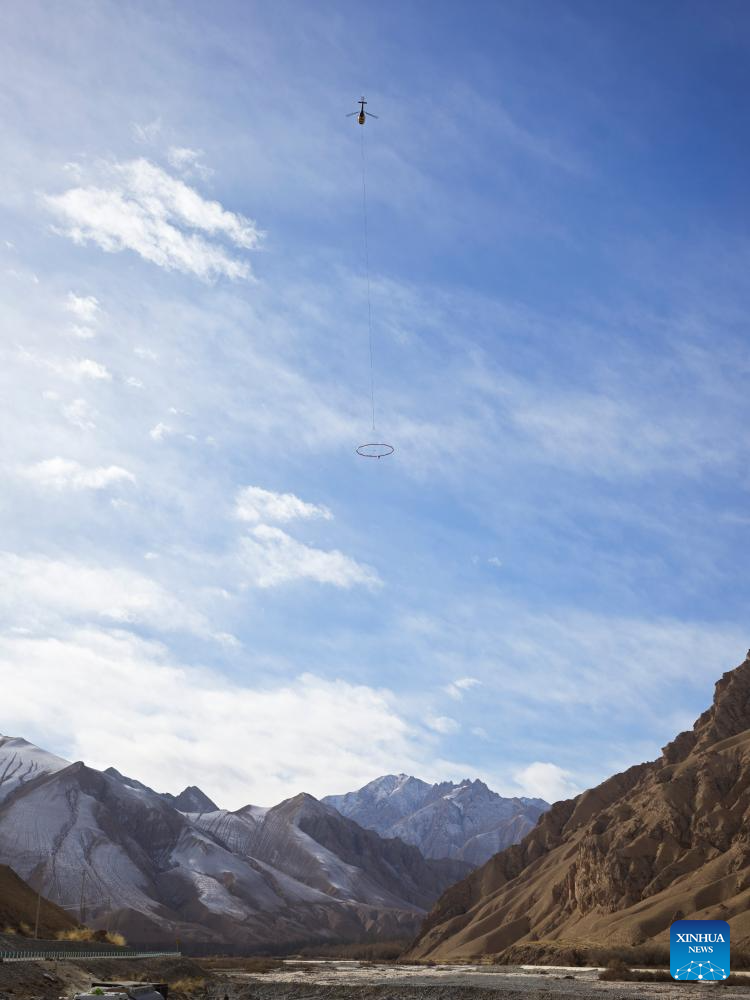 The helicopter airborne magnetotelluric detection system works in Hetian, northwest China's Xinjiang Uygur Autonomous Region, Dec. 21, 2024. China's first helicopter airborne magnetotelluric detection system has been successfully applied to a plateau railway construction project, the Chinese Academy of Sciences' Aerospace Information Research Institute (AIR) said on Tuesday. (Photo by Guo Feng/Xinhua)