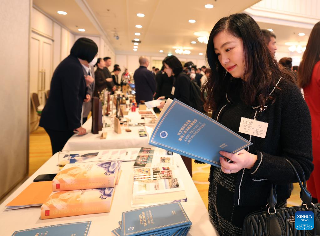 A delegate reads a report titled "Promoting the Development and Progress of Human Civilization through Exchange and Mutual Learning" at the ongoing dialogue on boosting cultural exchange between media organizations and think tanks of China and Japan in Tokyo, Japan, Feb. 18, 2025. The National High-Level Think Tank of the Xinhua News Agency on Tuesday issued a report in Tokyo, capital of Japan, titled "Promoting the Development and Progress of Human Civilization through Exchange and Mutual Learning."