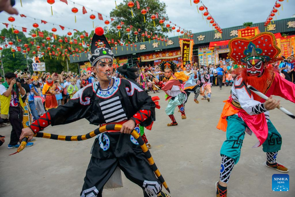 Members of Yingge teams from China and Malaysia perform during a parade in Johor, Malaysia, Feb. 18, 2025. Yingge teams from China and Malaysia staged Yingge dances during a parade here on Tuesday, attracting lots of audience on the spot. (Photo by Chong Voon Chung/Xinhua)