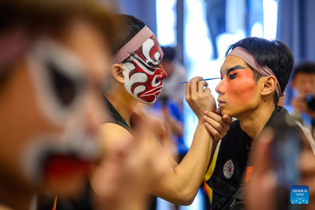 Members of a Yingge team from China put on makeup for performance in Johor, Malaysia, Feb. 18, 2025. Yingge teams from China and Malaysia staged Yingge dances during a parade here on Tuesday, attracting lots of audience on the spot. (Photo by Chong Voon Chung/Xinhua)