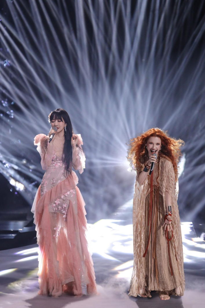 Alexia Evellyn (right) performs the Chinese song "Upwards to the Moon" in a duet with Chinese singer Sa Dingding. (Photo provided by Alexia Evellyn)