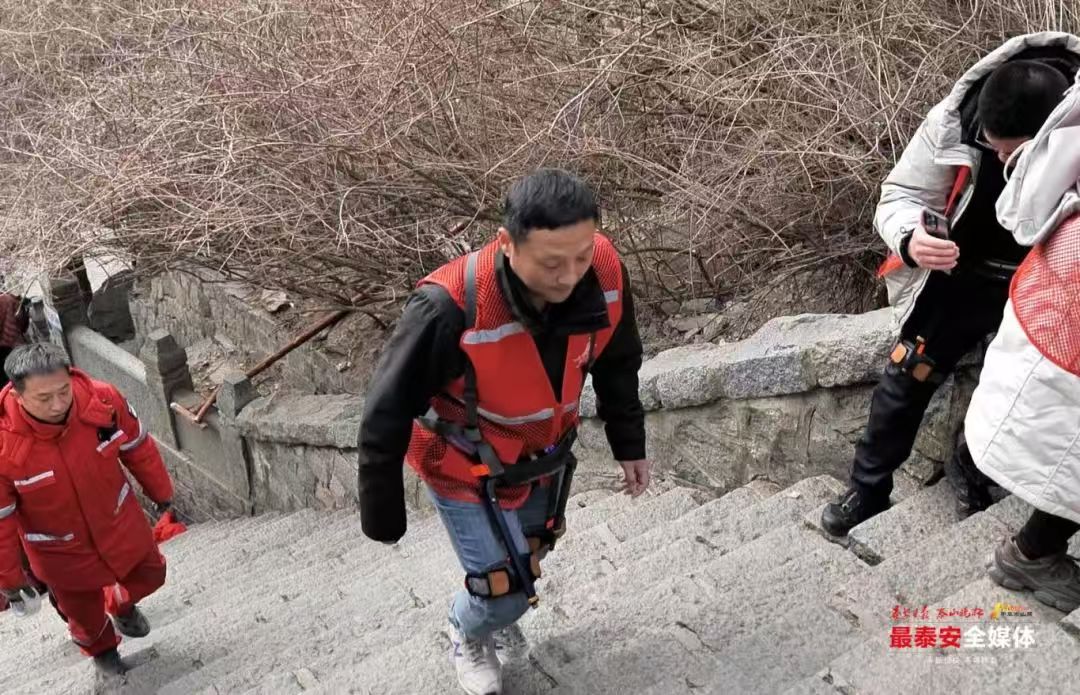 A man wearing the exoskeleton climbs Mount Taishan. (Photo/Taishanwanbao)