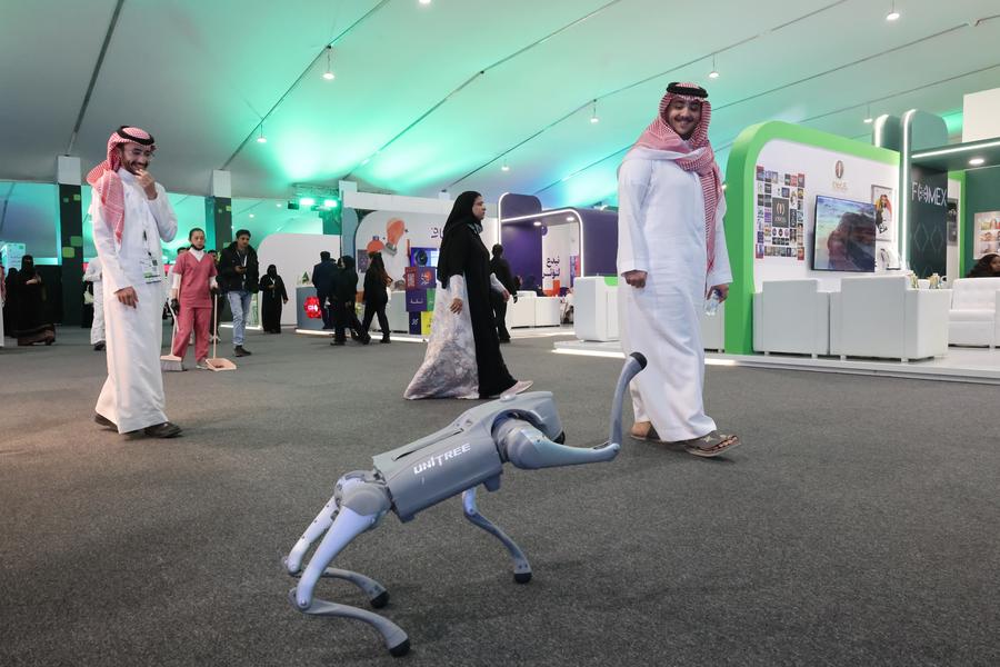 People watch the performance of a robot dog launched by the Chinese company, Unitree Robotics, at the Future of Media Exhibition in Riyadh, Saudi Arabia, on Feb. 20, 2025. (Xinhua/Yin Ke)