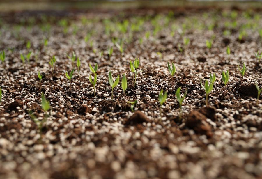 This photo shows pepper seedlings in the Zhangshugang pepper space-mutation breeding and scientific cultivation base of Yangque Lake in Zhangshu Town of Yueyang City, central China's Hunan Province, Nov. 26, 2024. (Xinhua/Wang Jingqiang)