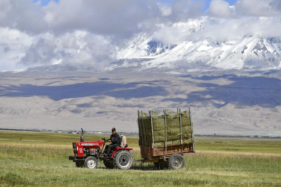 A herdsman drives his tractor loaded with reaped forage grass in Taxkorgan Tajik Autonomous County, northwest China's Xinjiang Uygur Autonomous Region, Aug. 27, 2023. (Xinhua/Hu Huhu)