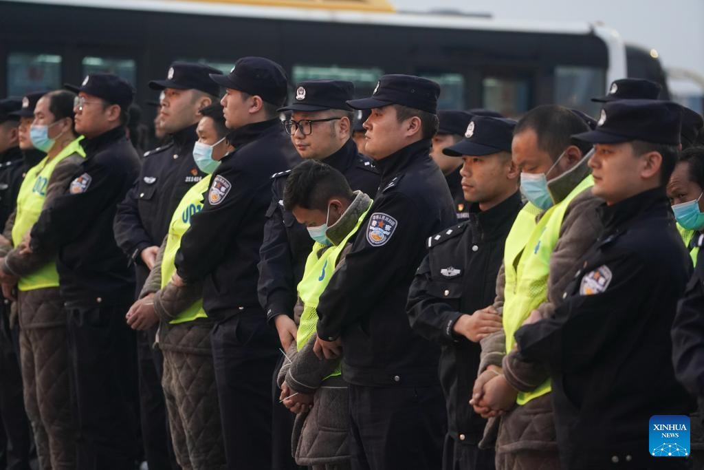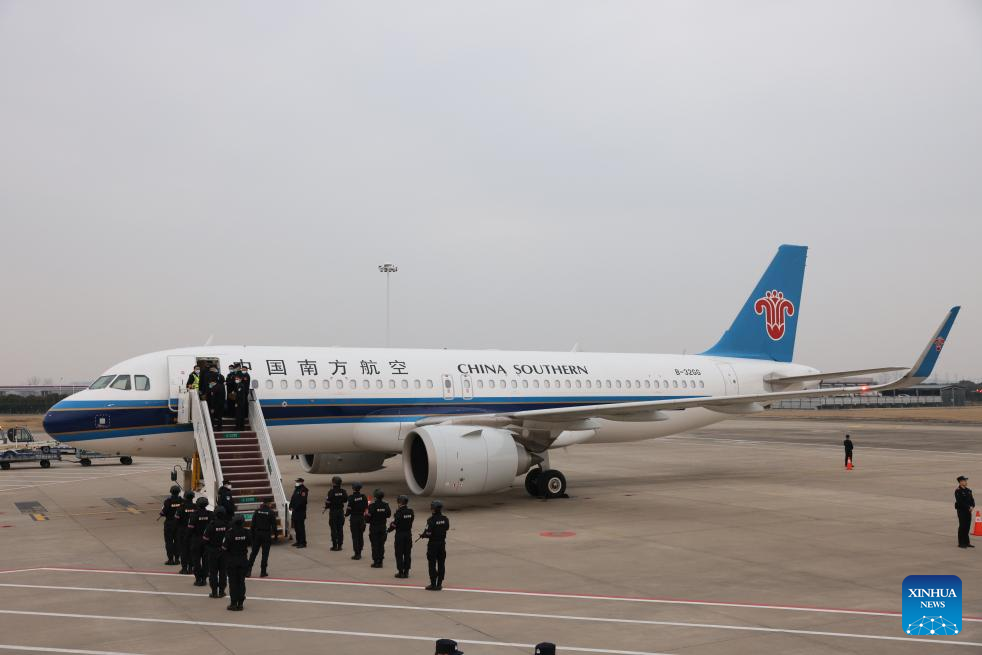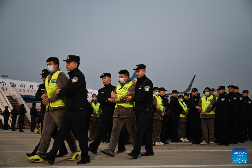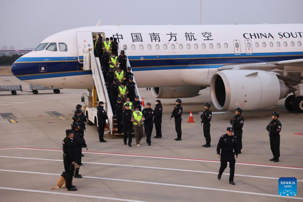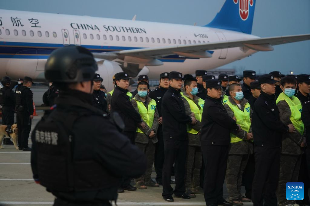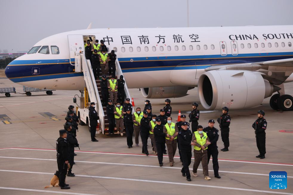 A group of 200 Chinese citizens suspected of involvement in fraud returned to China under the escort of Chinese police on Thursday after being repatriated from Myawaddy in Myanmar. The suspects were first sent to Thailand before being flown back to China on several chartered flights, which arrived at an airport in Nanjing, the capital of eastern Jiangsu Province. The repatriation of these suspects marks a significant achievement of law enforcement cooperation between China, Myanmar and Thailand against telecom fraud, according to a statement by the Ministry of Public Security. (Xinhua/Ji Chunpeng)