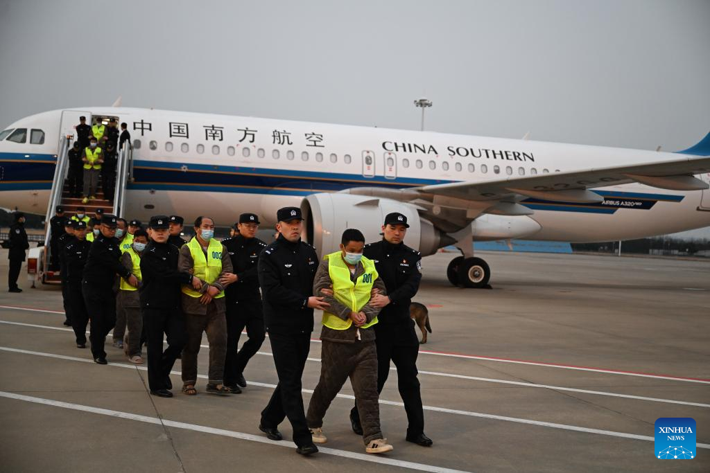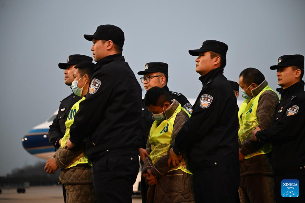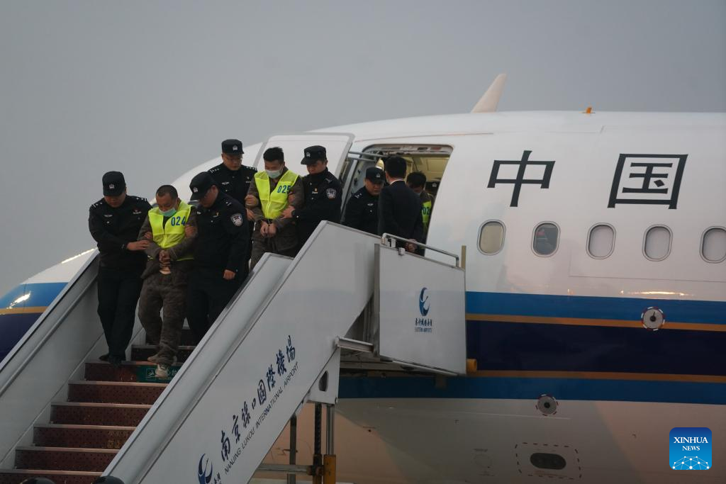 A group of 200 Chinese citizens suspected of involvement in fraud returned to China under the escort of Chinese police on Thursday after being repatriated from Myawaddy in Myanmar. The suspects were first sent to Thailand before being flown back to China on several chartered flights, which arrived at an airport in Nanjing, the capital of eastern Jiangsu Province. The repatriation of these suspects marks a significant achievement of law enforcement cooperation between China, Myanmar and Thailand against telecom fraud, according to a statement by the Ministry of Public Security. (Xinhua/Yin Gang)