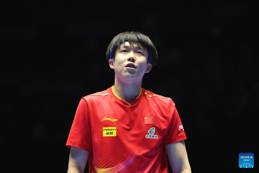 Wang Chuqin reacts during the men's singles Group 2 match between Wang Chuqin of China and Uda Yukiya of Japan at the 34th ITTF-ATTU Asian Cup table tennis tournament in Shenzhen, south China's Guangdong Province, Feb. 20, 2025. (Xinhua/Liang Xu)