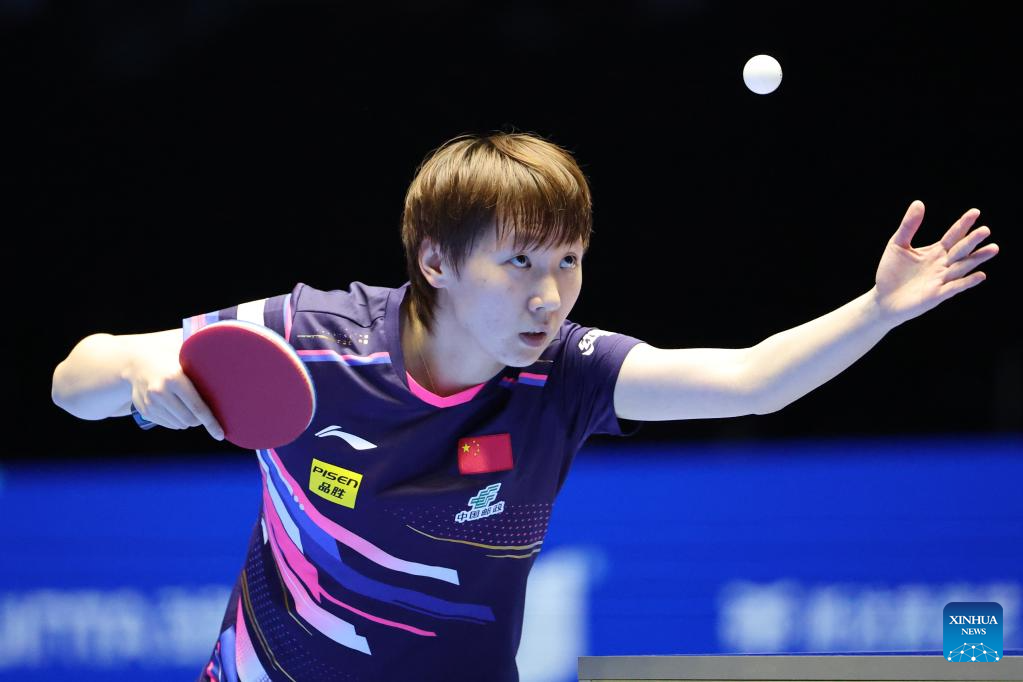 Sun Yingsha of China hits a return during the women's singles group 1 match against Sreeja Akula of India at the 34th ITTF-ATTU Asian Cup table tennis tournament in Shenzhen, south China's Guangdong Province, Feb. 20, 2025. (Xinhua/Liang Xu)