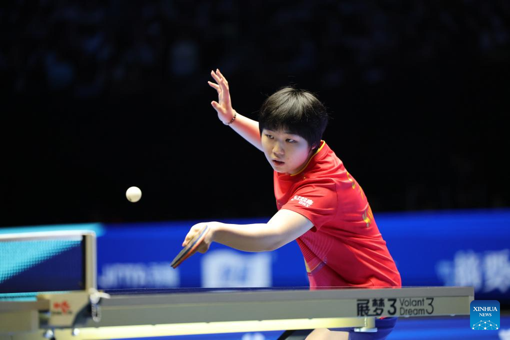 Kuai Man of China hits a return during the women's singles Group 7 match against Ito Mima of Japan at the 34th ITTF-ATTU Asian Cup table tennis tournament in Shenzhen, south China's Guangdong Province, Feb. 20, 2025. (Xinhua/Liang Xu)