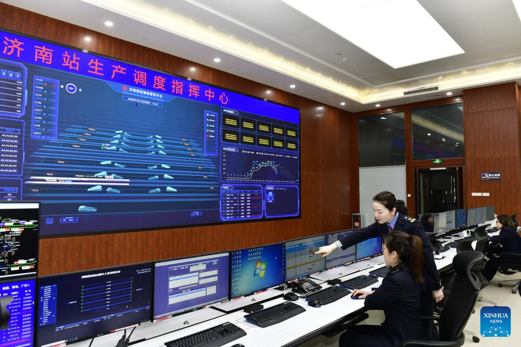 Shao Lili (R) conducts a survey on digital and intelligent railway construction at the production and dispatch command center of Jinan Railway Station in Jinan, east China's Shandong Province, Feb. 18, 2025. (Xinhua/Guo Xulei)