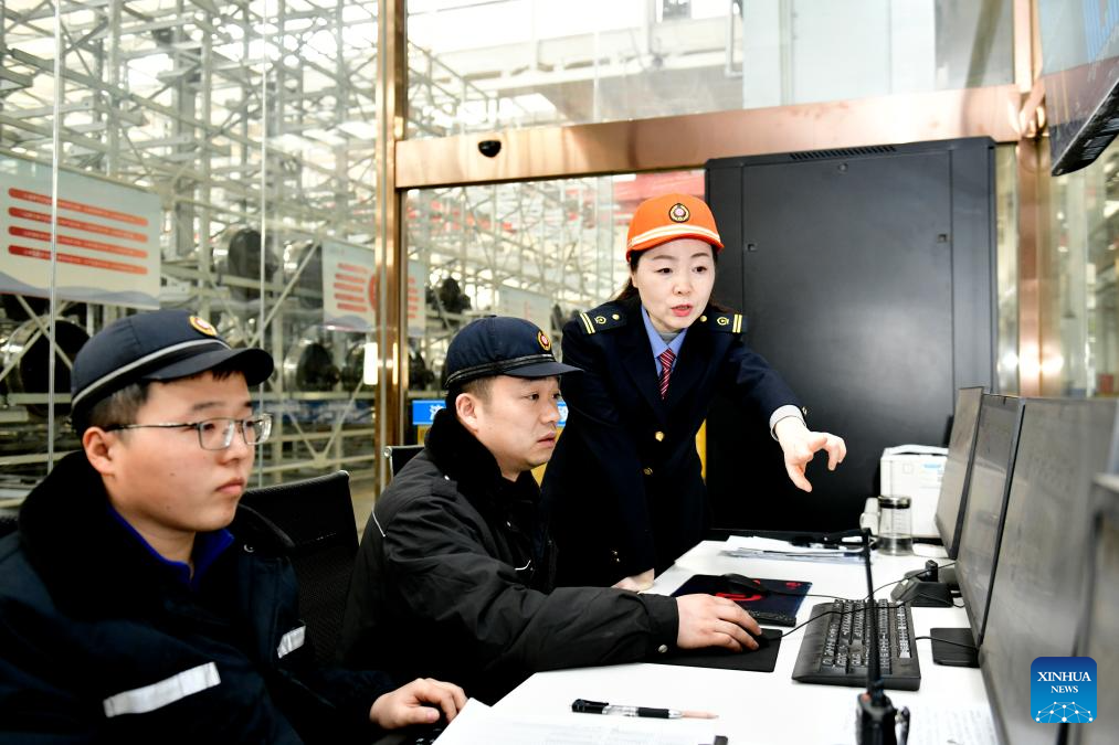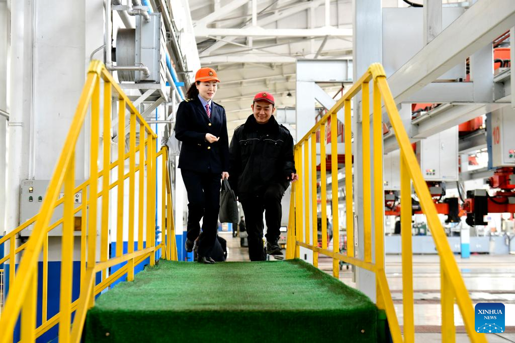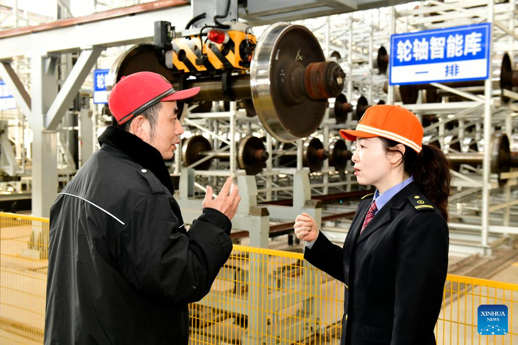 Shao Lili (R) conducts a survey on the construction of digital and intelligent depots and the maintenance of passenger train wheels at a train depot in Jinan, east China's Shandong Province, Feb. 18, 2025. (Xinhua/Guo Xulei)
