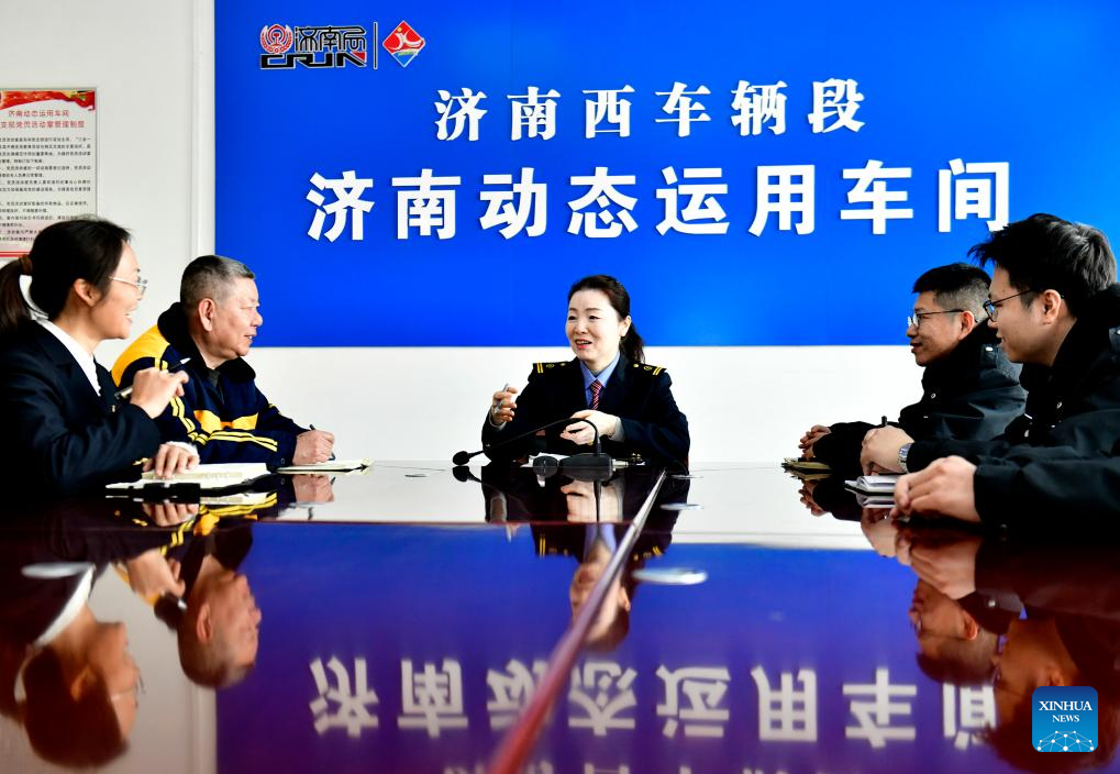 Shao Lili (C) conducts a survey on present situation and demand of information management and digital technology application in railway train maintenance at a train depot in Jinan, east China's Shandong Province, Feb. 18, 2025. (Xinhua/Guo Xulei)