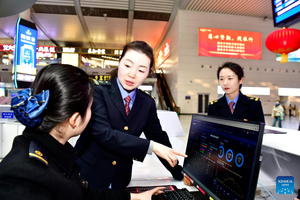 Shao Lili (C) conducts a survey on the application of the intelligent passenger station control platform at the service center of Jinan West Railway Station in Jinan, east China's Shandong Province, Feb. 18, 2025. (Xinhua/Guo Xulei)