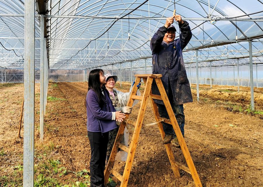 Tian Shuxian (1st L) guides a villager to overhaul the irrigation sprinkler system in a green house in Anfeng Village, Zhonghuopu Town of Chibi City, central China's Hubei Province, on Feb. 18, 2025. (Xinhua)