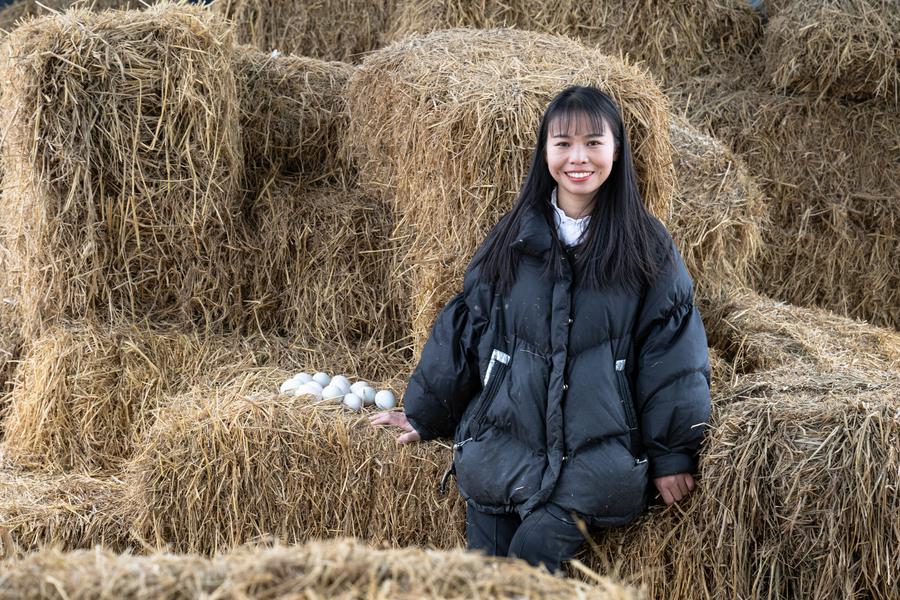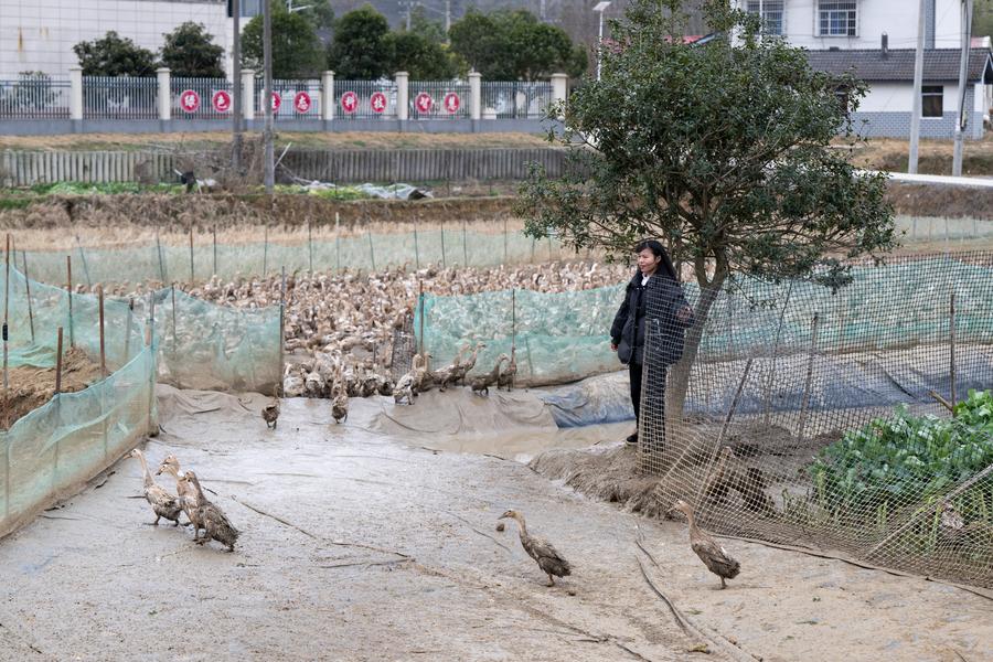 Tian Shuxian checks growth of the ducks in Anfeng Village, Zhonghuopu Town of Chibi City, central China's Hubei Province, on Feb. 7, 2025. (Xinhua/Xiao Yijiu)