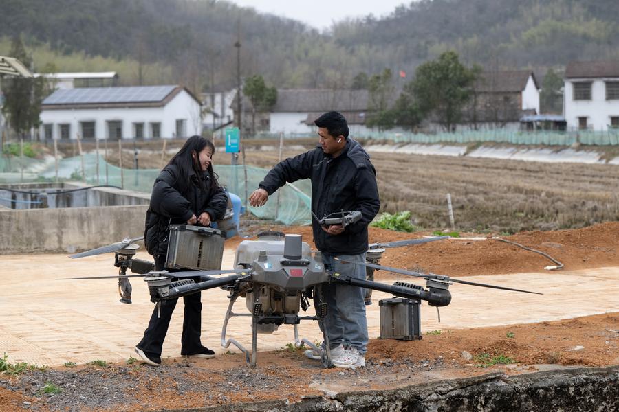 Tian Shuxian (L) and her husband change the battery of a farm drone in Anfeng Village, Zhonghuopu Town of Chibi City, central China's Hubei Province, on Feb. 7, 2025. (Xinhua/Xiao Yijiu)