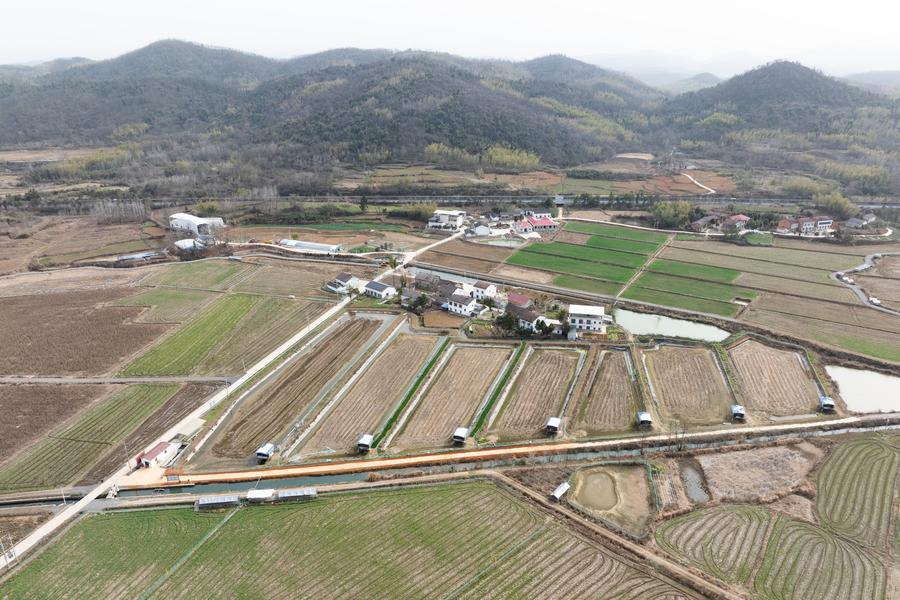 An aerial drone photo shows the farmlands cultivated by Tian Shuxian, in Anfeng Village, Zhonghuopu Town of Chibi City, central China's Hubei Province, on Feb. 7, 2025. (Xinhua/Xiao Yijiu)