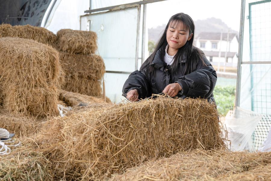 Tian Shuxian carries forage in Anfeng Village, Zhonghuopu Town of Chibi City, central China's Hubei Province, on Feb. 7, 2025. (Xinhua/Xiao Yijiu)