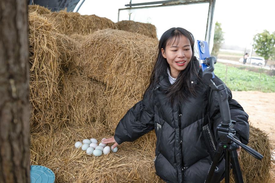 Tian Shuxian shows the duck eggs to audience via livestreaming in Anfeng Village, Zhonghuopu Town of Chibi City, central China's Hubei Province, on Feb. 7, 2025. (Xinhua/Xiao Yijiu)
