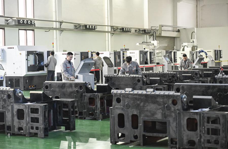 Workers operate at a workshop of Chongqing Honggang Numerical Control Machine Tool Co., Ltd. in southwest China's Chongqing Municipality, Feb. 22, 2025. (Xinhua/Wang Quanchao)