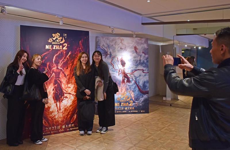 People pose for photos in front of the poster of the Chinese animated feature Ne Zha 2 at a cinema in Hong Kong, Feb 18, 2025. (Photo/Xinhua)