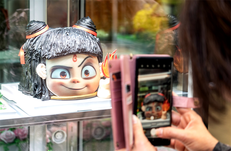 A Ne Zha-themed cake on display at a bakery in Wan Chai, Hong Kong, attracts the attention of a passer-by on Saturday. (Hou Yu/China News Service)