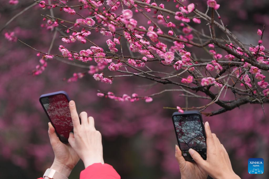 Tourists take photos of plum blossoms at the foot of the Lingfeng Mountain in Hangzhou, east China's Zhejiang Province, Feb. 23, 2025. February tends to be the best season for viewing plum blossoms at Lingfeng Mountain, a popular destination for flower-viewing tour in Hangzhou, east China's Zhejiang Province. It has risen to fame since Qing Dynasty (1644-1911). Currently there are about 5,000 plum trees covering more than 100 varieties. (Xinhua/Weng Xinyang)