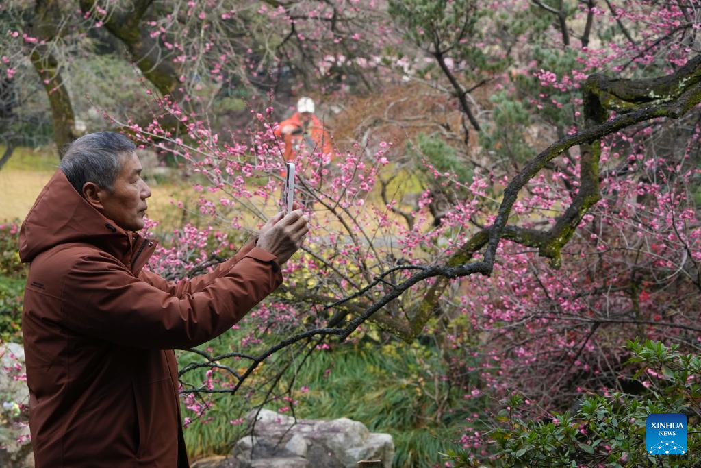 A tourist takes photos of plum blossoms at the foot of the Lingfeng Mountain in Hangzhou, east China's Zhejiang Province, Feb. 23, 2025. February tends to be the best season for viewing plum blossoms at Lingfeng Mountain, a popular destination for flower-viewing tour in Hangzhou, east China's Zhejiang Province. It has risen to fame since Qing Dynasty (1644-1911). Currently there are about 5,000 plum trees covering more than 100 varieties. (Xinhua/Weng Xinyang)