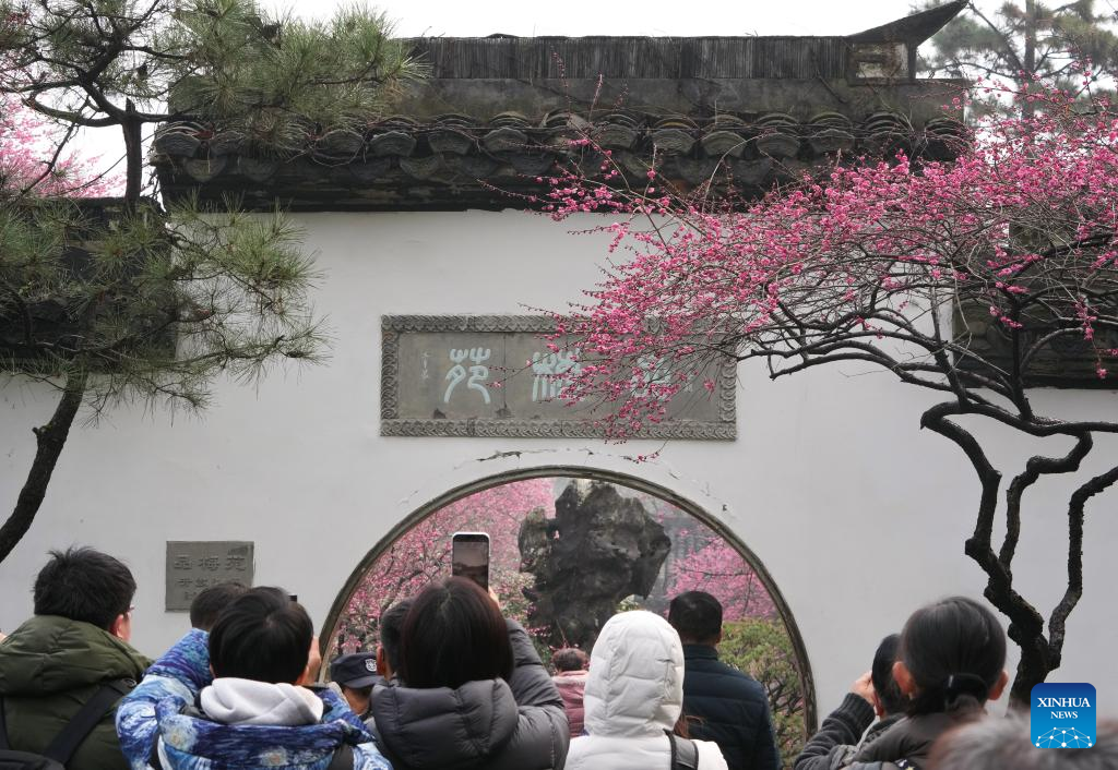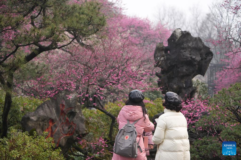 Tourists enjoy plum blossoms at Lingfeng Mountain scenic area in Hangzhou, east China's Zhejiang Province, Feb. 23, 2025. February tends to be the best season for viewing plum blossoms at Lingfeng Mountain, a popular destination for flower-viewing tour in Hangzhou, east China's Zhejiang Province. It has risen to fame since Qing Dynasty (1644-1911). Currently there are about 5,000 plum trees covering more than 100 varieties. (Xinhua/Weng Xinyang)
