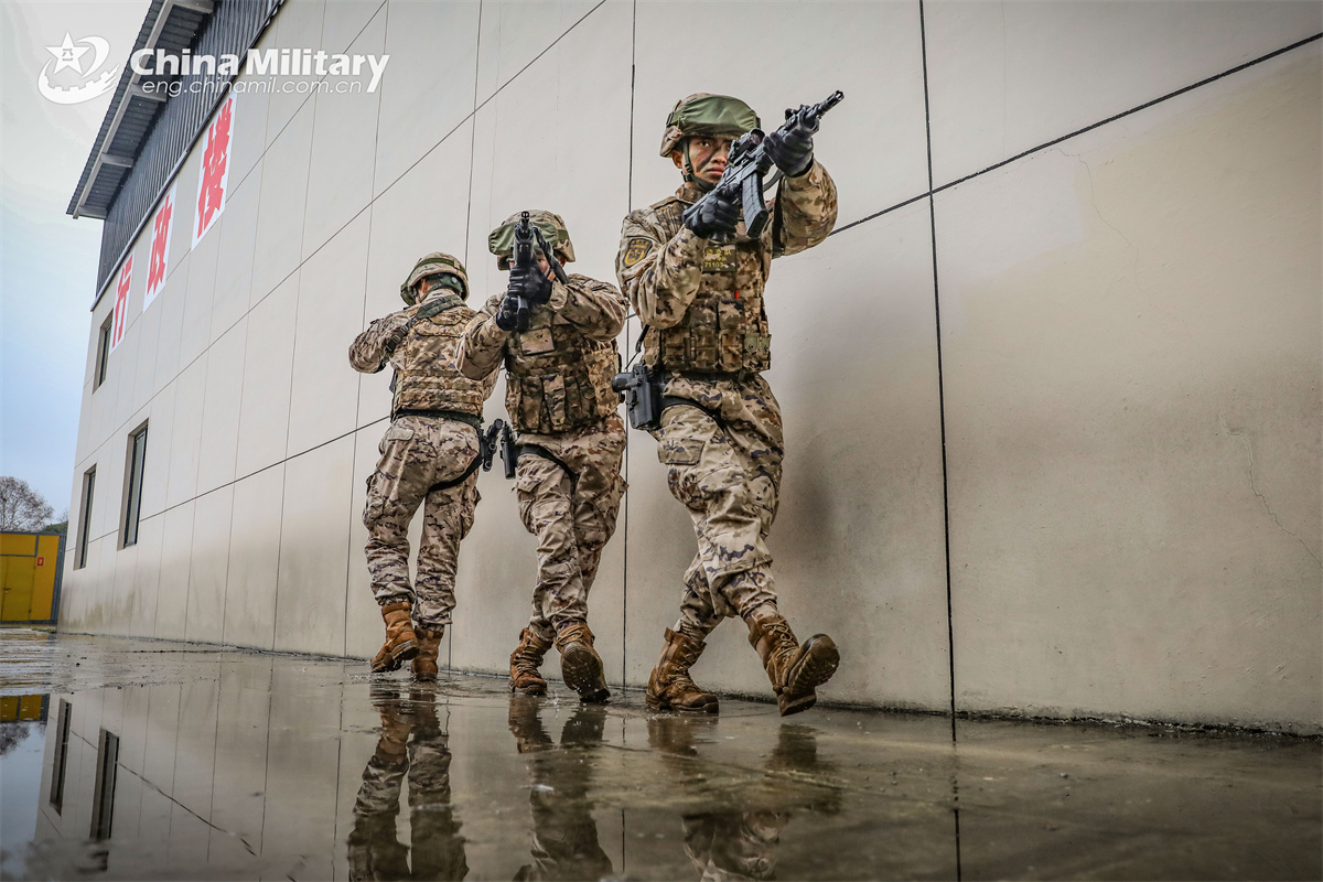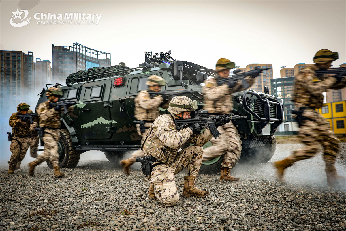 Special operations soldiers assigned to a detachment under the Chinese People's Armed Police (PAP) Force Guizhou Corps advance swiftly towards the targets during a recent comprehensive counter-terrorism exercise simulating a train hijacking scenario. (eng.chinamil.com.cn/Photo by Chen Dijie)