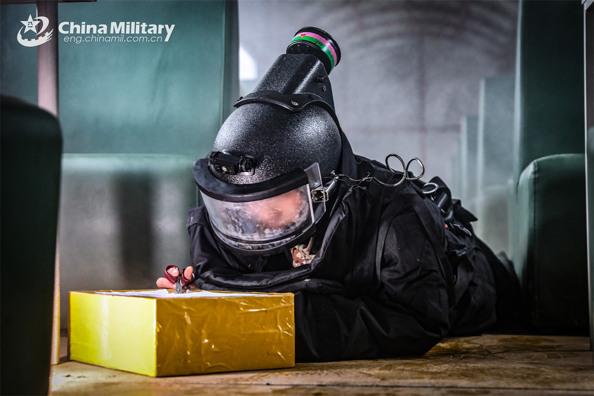 A special operations soldier assigned to a detachment under the Chinese People's Armed Police (PAP) Force Guizhou Corps conducts explosive ordnance disposal (EOD) operation during a recent comprehensive counter-terrorism exercise simulating a train hijacking scenario. (eng.chinamil.com.cn/Photo by Chen Dijie)
