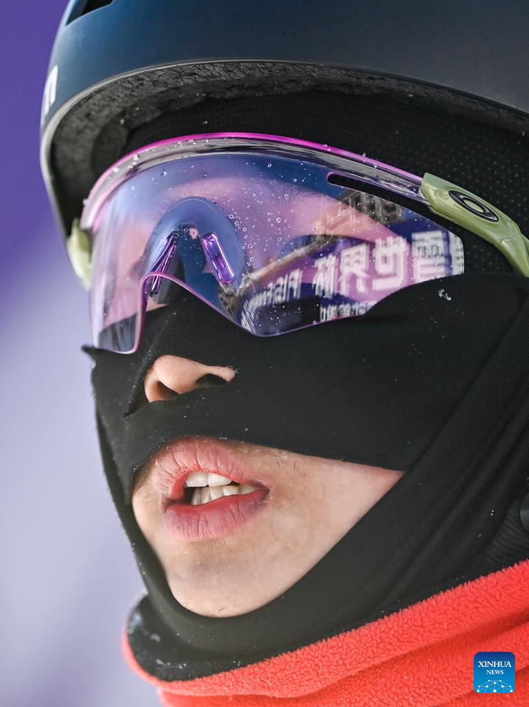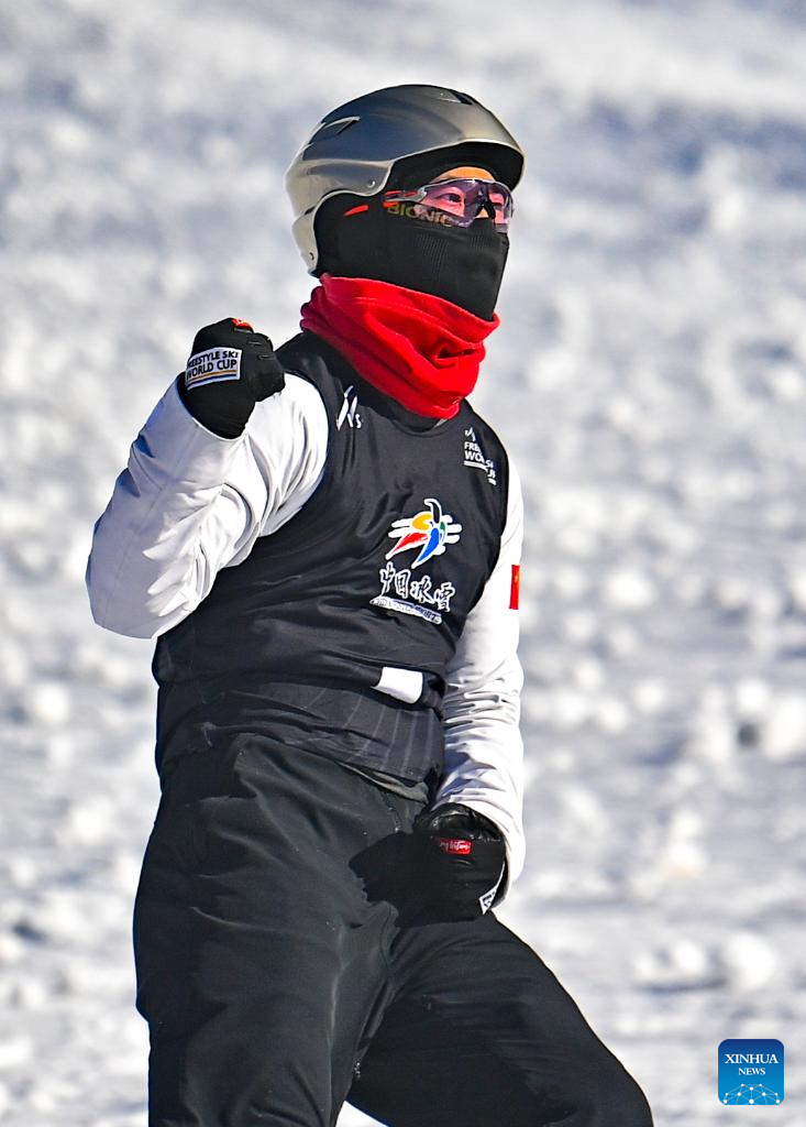 Wang Xindi of Team China 2 reacts during the final of Mixed Team Aerials at FIS Freestyle Ski World Cup 2025 in Jilin City, northeast China's Jilin Province, Feb. 24, 2025. (Xinhua/Yan Linyun)