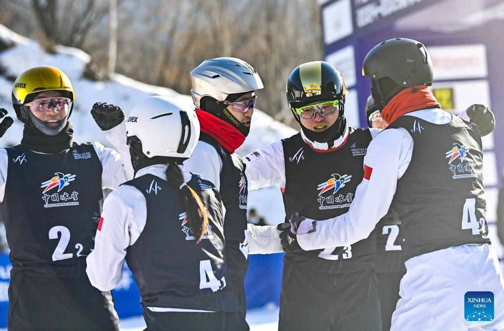 Athletes of Team China 1 and Team China 2 celebrate after the final of Mixed Team Aerials at FIS Freestyle Ski World Cup 2025 in Jilin City, northeast China's Jilin Province, Feb. 24, 2025. (Xinhua/Yan Linyun)