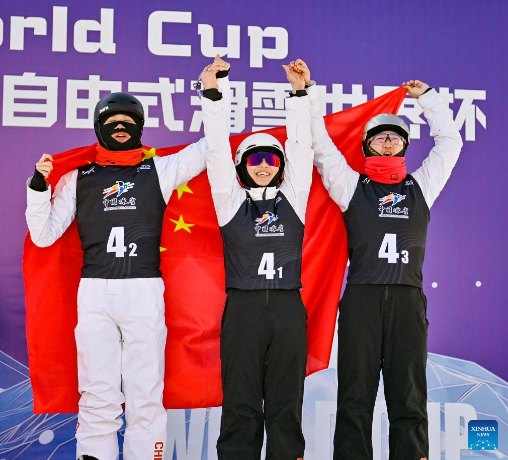 Li Xinpeng, Chen Meiting and Wang Xindi (L to R) of Team China 2 celebrate during the awarding ceremony after the final of Mixed Team Aerials at FIS Freestyle Ski World Cup 2025 in Jilin City, northeast China's Jilin Province, Feb. 24, 2025. (Xinhua/Yan Linyun)