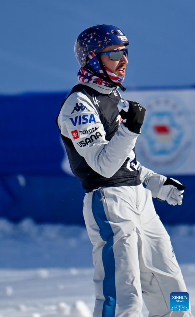 Christopher Lillis of the Team United States of America 1 reacts during the final of Mixed Team Aerials at FIS Freestyle Ski World Cup 2025 in Jilin City, northeast China's Jilin Province, Feb. 24, 2025. (Xinhua/Yan Linyun)