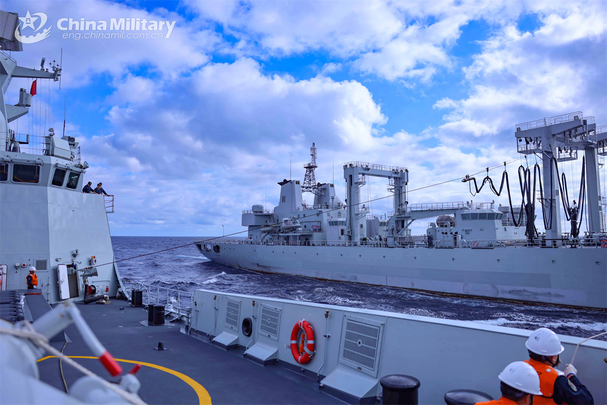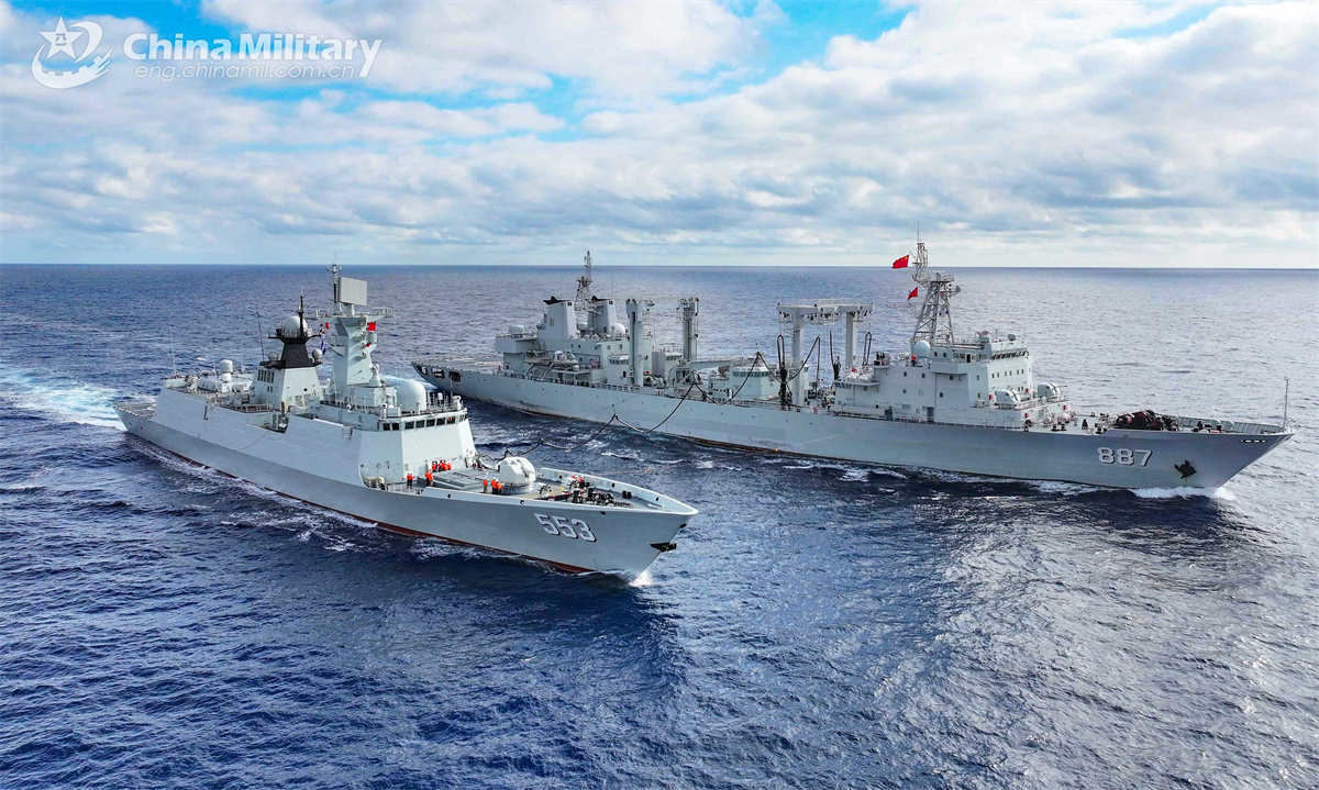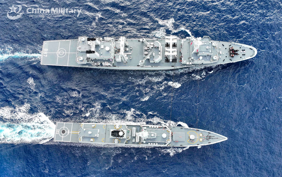 Comprehensive supply ship Weishanhu (Hull 887) and guided-missile frigate Dali (Hull 553) attached to a flotilla of the Chinese PLA Navy conduct alongside replenishment-at-sea during an emergency supply training exercise on February 1, 2025. (eng.chinamil.com.cn/Photo by Cai Shengqiu)
