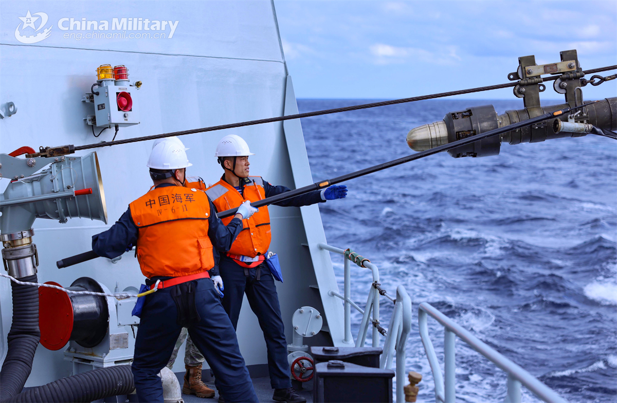 Two sailors aboard the guided-missile frigate Dali (Hull 553) attached to a flotilla of the Chinese PLA Navy receive the fueling probe during an emergency supply training exercise on February 1, 2025. (eng.chinamil.com.cn/Photo by Cai Shengqiu)