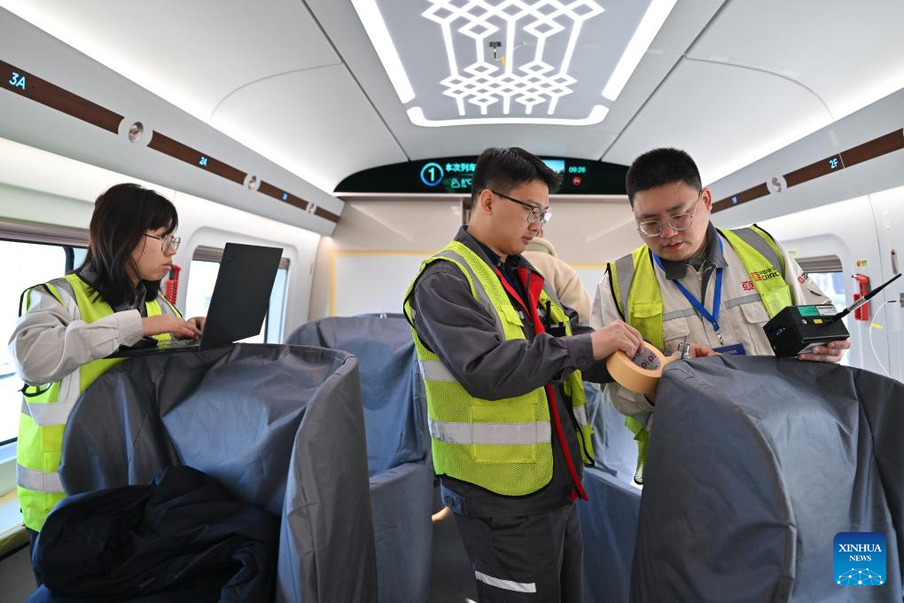 A staff worker conducts experiment in a prototype of CR450 bullet train in Beijing, capital of China, Feb. 25, 2025. (Xinhua/Li Xin)