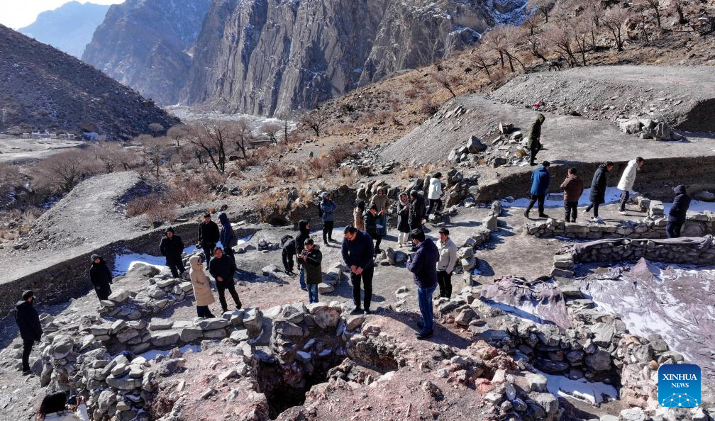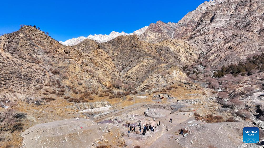 This drone photo taken on Feb.22, 2025 shows experts conduct field survey at the Suyukou kiln in Helan Mountain in Yinchuan, capital of northwest China's Ningxia Hui Autonomous Region. Porcelain wares unearthed in northwest China's Ningxia Hui Autonomous Region, which were produced nearly 1,000 years ago during an ethnic minority-ruled dynasty, bear high resemblance to those made in the "porcelain capital" of Jingdezhen in east China. (Xinhua/Feng Kaihua)