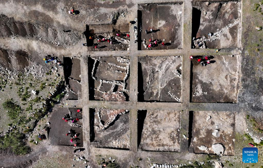 This aerial drone photo taken on Oct. 24, 2024 shows archaeologists conduct excavations at the Suyukou kiln in Helan Mountain in Yinchuan, capital of northwest China's Ningxia Hui Autonomous Region. Porcelain wares unearthed in northwest China's Ningxia Hui Autonomous Region, which were produced nearly 1,000 years ago during an ethnic minority-ruled dynasty, bear high resemblance to those made in the "porcelain capital" of Jingdezhen in east China. (Xinhua/Feng Kaihua)