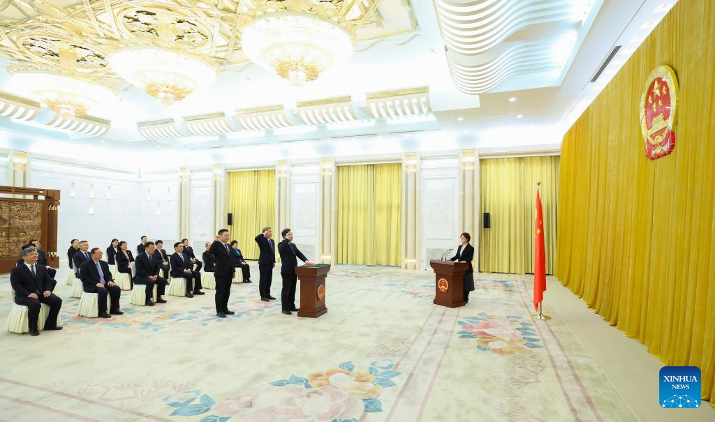 Tie Ning, vice chairperson of the National People's Congress (NPC) Standing Committee, chairs and oversees an oath-taking ceremony held by the 14th NPC Standing Committee to pledge allegiance to the Constitution at the Great Hall of the People in Beijing, capital of China, Feb. 25, 2025. (Xinhua/Huang Jingwen)