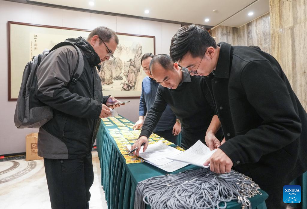A journalist (1st L) claims press card at a press center for China's annual "two sessions" in Beijing, capital of China, Feb. 27, 2025. A press center for China's annual sessions of its top legislature and political advisory body, known as the "two sessions," opened Thursday at the Media Center Hotel in Beijing. (Xinhua/Chen Yehua)