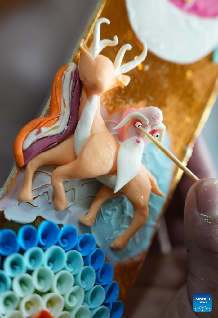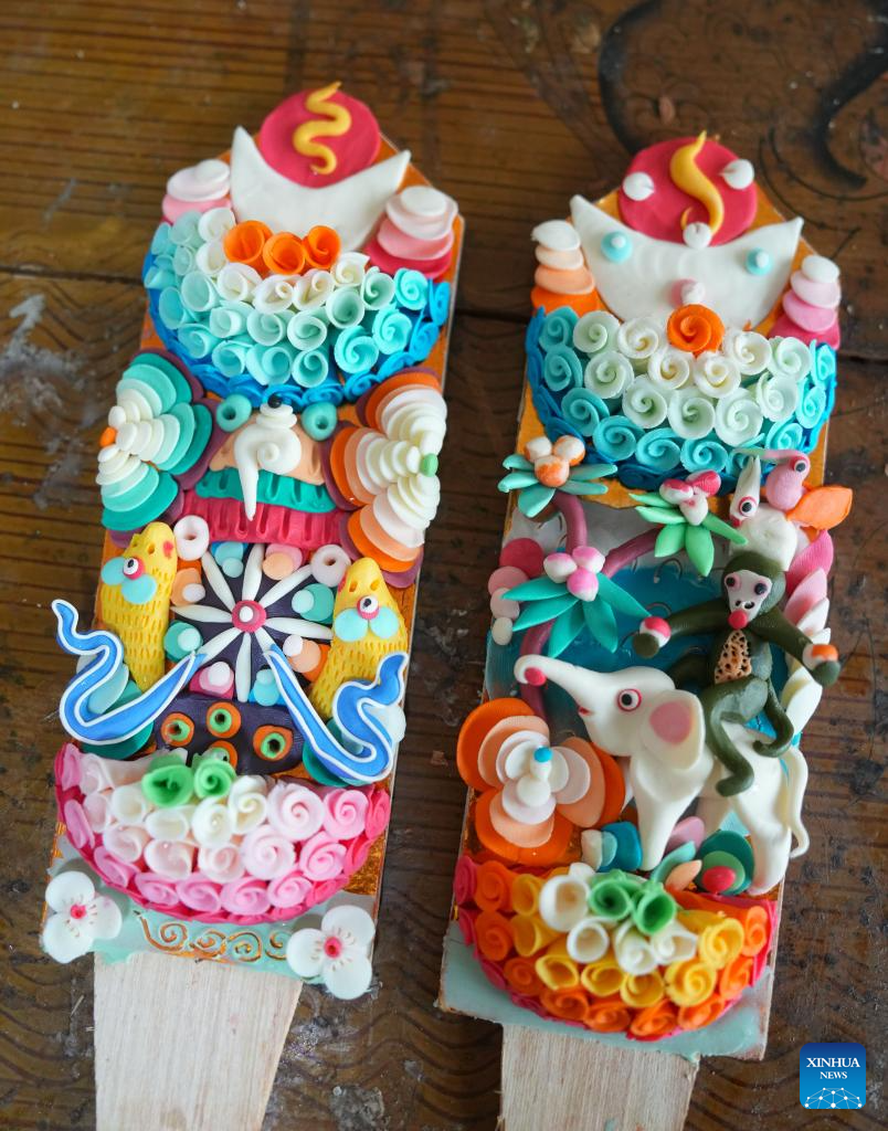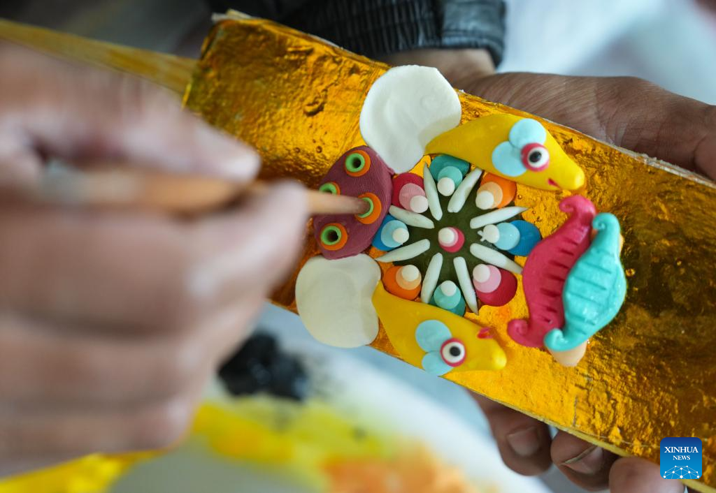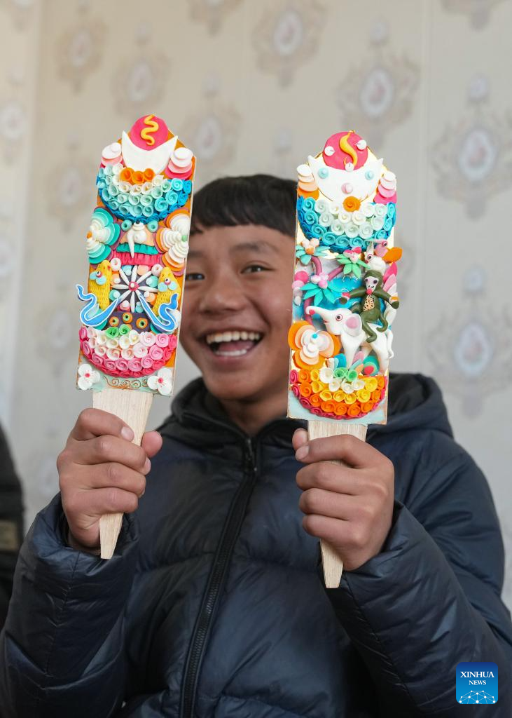 An apprentice demonstrates butter sculptures in Lhasa, southwest China's Xizang Autonomous Region, Feb. 25, 2025. Ahead of the upcoming Tibetan New Year, the butter sculptures in shapes of trees, flowers, birds, animals, etc., have enjoyed widespread popularity across the city. (Xinhua/Jigme Dorje)