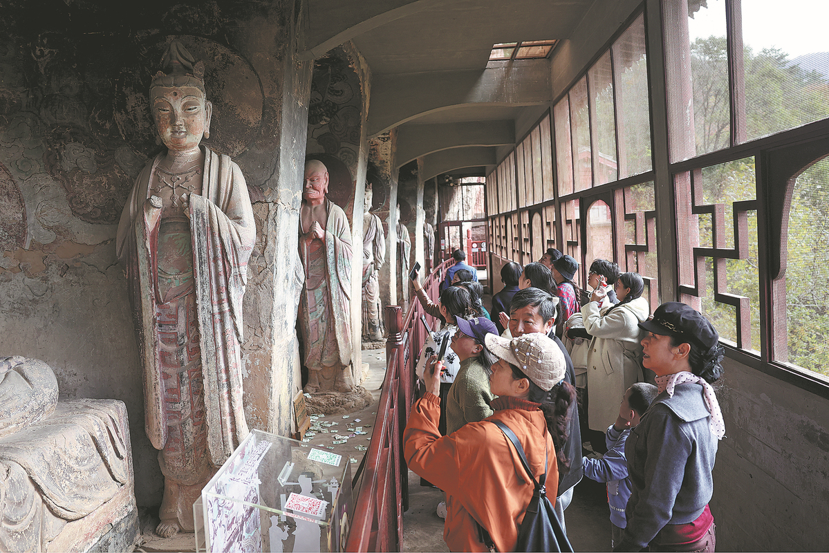 People take photos of the Buddhist statues at the Maiji Mountain Grottoes in Tianshui, Gansu province, on Nov 2. (Chen Bin/Xinhua)