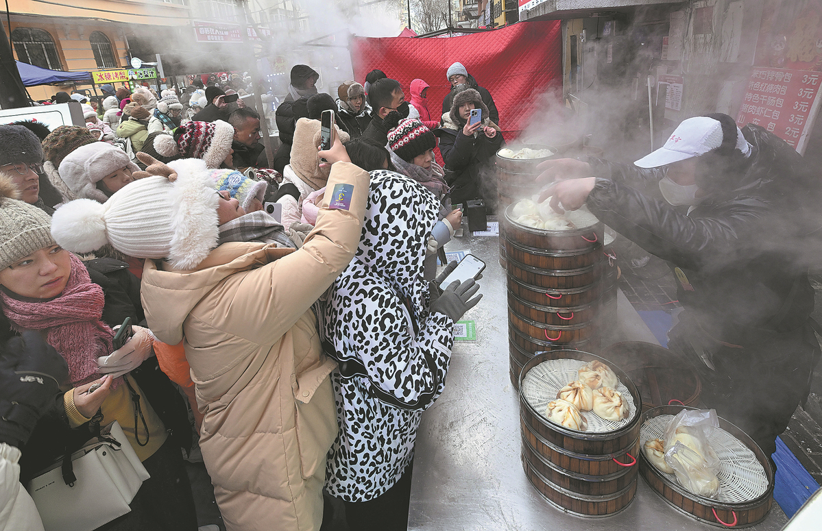 Tourists line up to buy steamed buns at a morning market in Harbin, Heilongjiang province, on Jan 28. (Liu Yang/Xinhua)