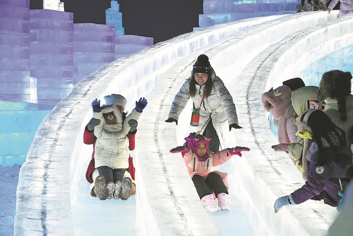 Visitors enjoy the thrill of the Super Ice Slide at Harbin Ice and Snow World on Jan 5. (Liu Yang/Xinhua)