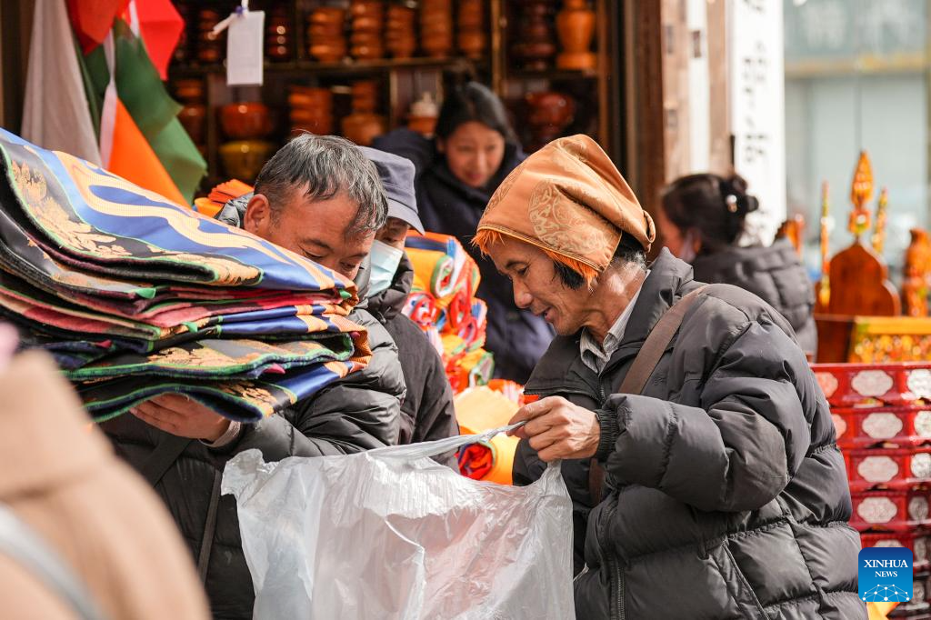 Customers buy Tibetan-style curtains at a local market in Lhasa, southwest China's Xizang Autonomous Region, Feb. 24, 2025. People in Lhasa are busy with making preparations ahead of the upcoming Tibetan New Year. (Xinhua/Jigme Dorje)