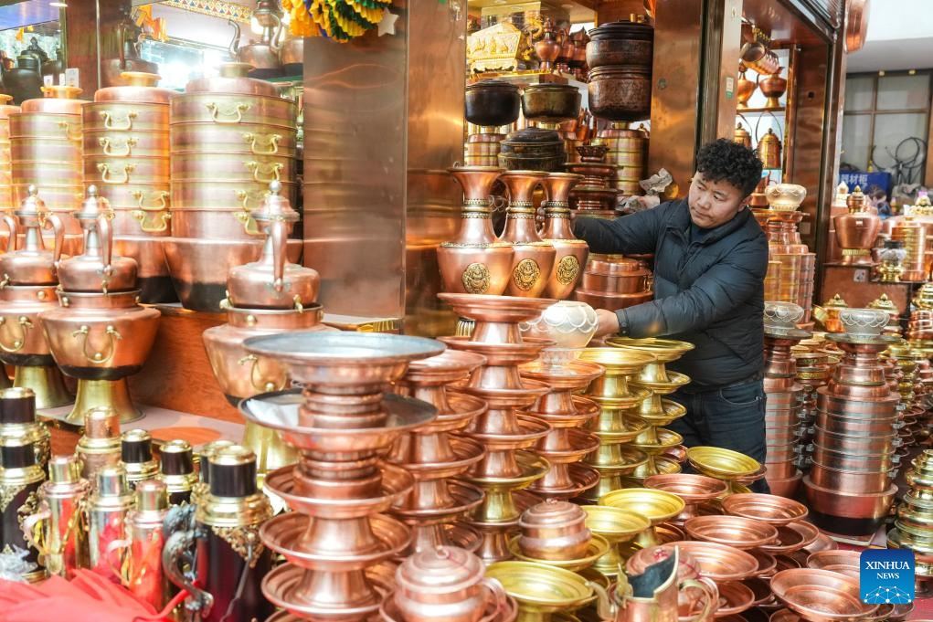 Vendors arrange goods at a local market in Lhasa, southwest China's Xizang Autonomous Region, Feb. 24, 2025. People in Lhasa are busy with making preparations ahead of the upcoming Tibetan New Year. (Xinhua/Jigme Dorje)
